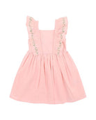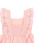 A delightful ode to spring, this pink cotton dress is adorned with delicate floral embroidery and finished with soft ruffle straps. Fully lined for comfort and designed with a shirred back for the perfect fit, it’s made for twirling at garden parties, birthdays, and sunny day adventures. Both charming and practical, this dress is a timeless favourite.